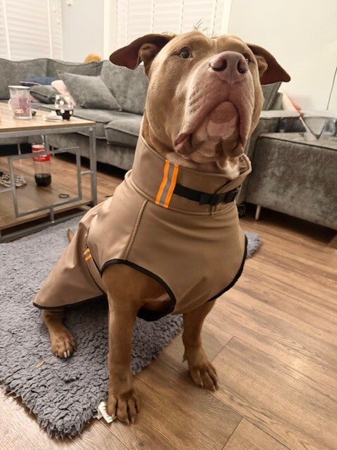 "Ace de Bully XL vindt zich zelf goed gestyled in zijn softshell regenjas."